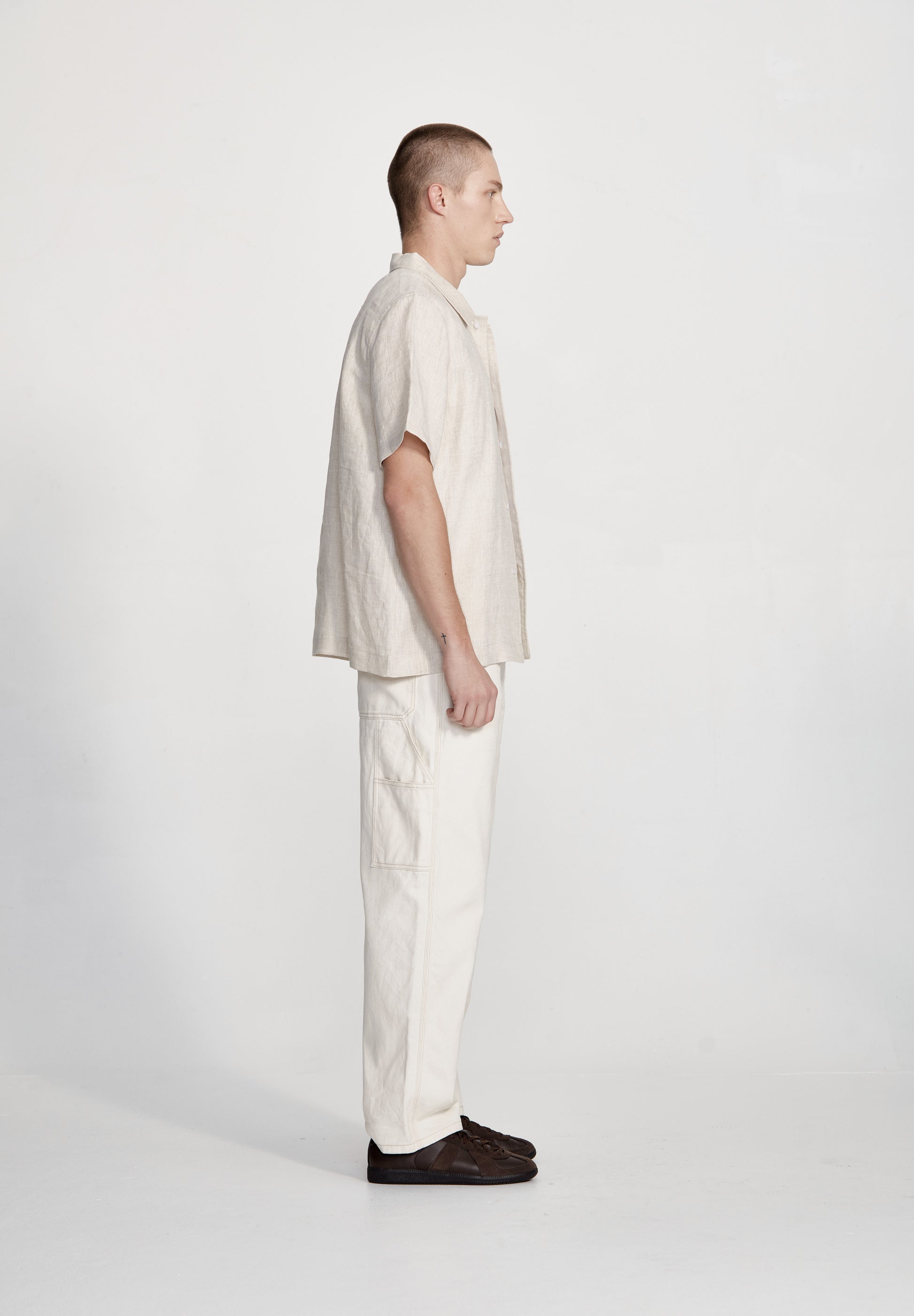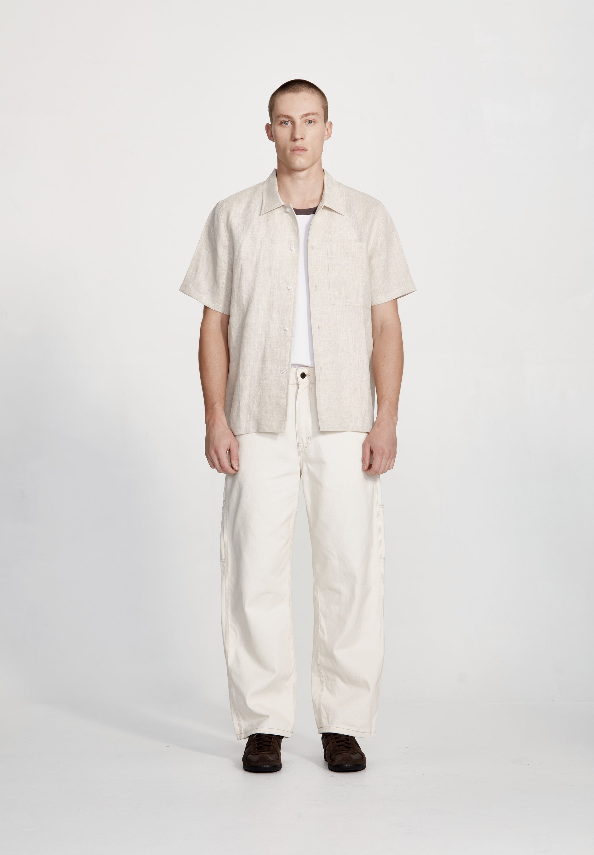 Constructed from a washed linen–cotton blend for a soft, broken-in feel. Designed with a camp collar and a boxy, relaxed fit. Wear it on its own or layered over a contrasting tank or tee for an effortless, laid-back look.