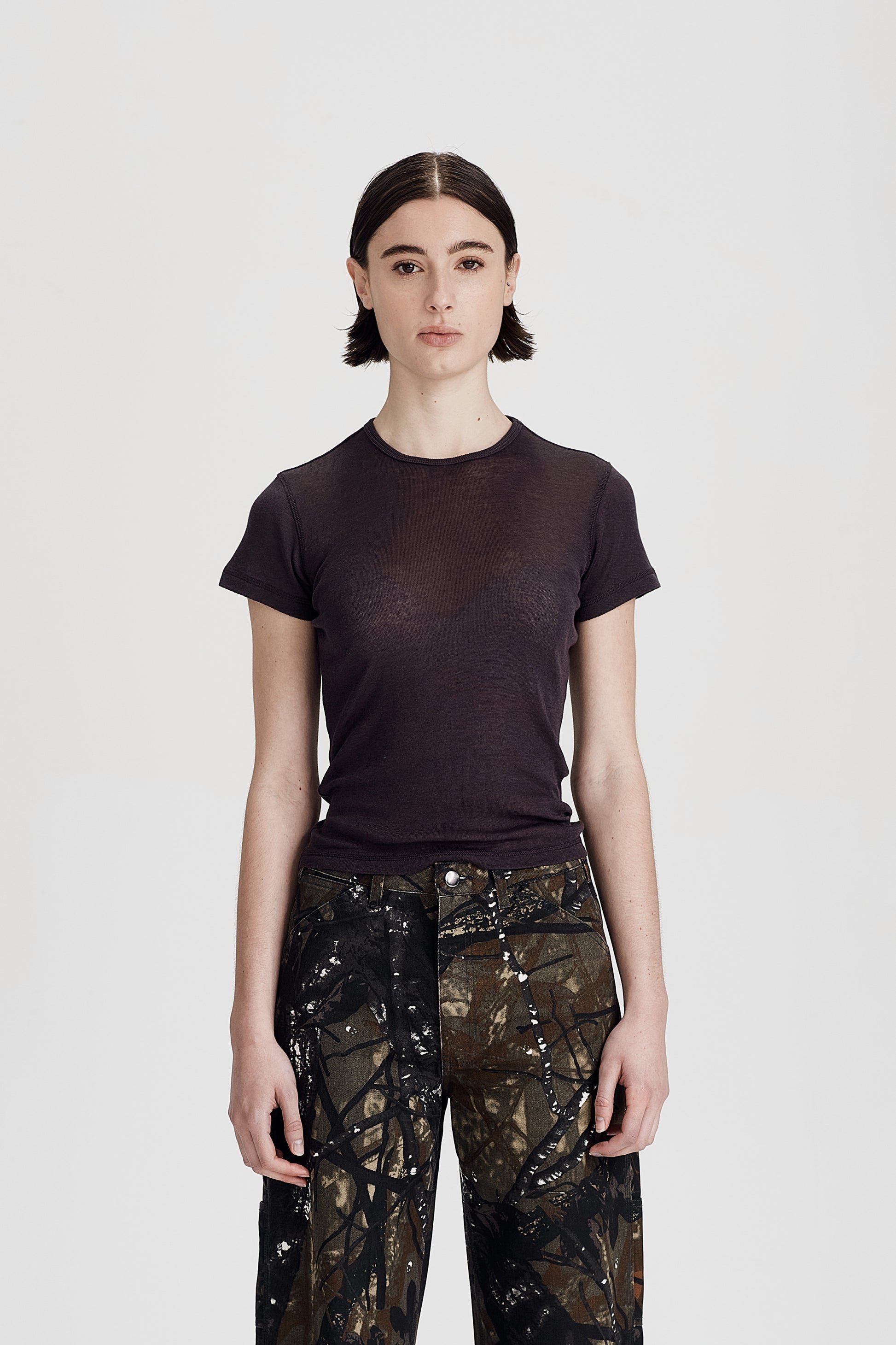 Effortless and essential, this short sleeve top is a true everyday staple. Made from a soft 50% cotton, 50% Tencel blend, it has a breathable, lightweight feel against the skin. The fabric is very light and slightly sheer, designed in a close-fitting silhouette that works perfectly for layering or wearing on its own..